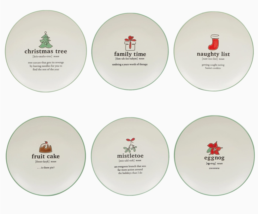 This delightful set of six 8.5-inch dessert plates from Certified International is a festive addition to any holiday table. Each plate features a unique Christmas-themed illustration and playful saying, ranging from "Christmas tree" to "naughty list," sure to spark conversation and smiles among guests. Their collectible nature and the classic green trim make them both a charming seasonal tradition and a versatile match for various table settings. Known for quality, these plates are not just for serving desserts but can also be used as appetizers or decorative elements, making them an excellent gift for those who love to host during the holiday season.